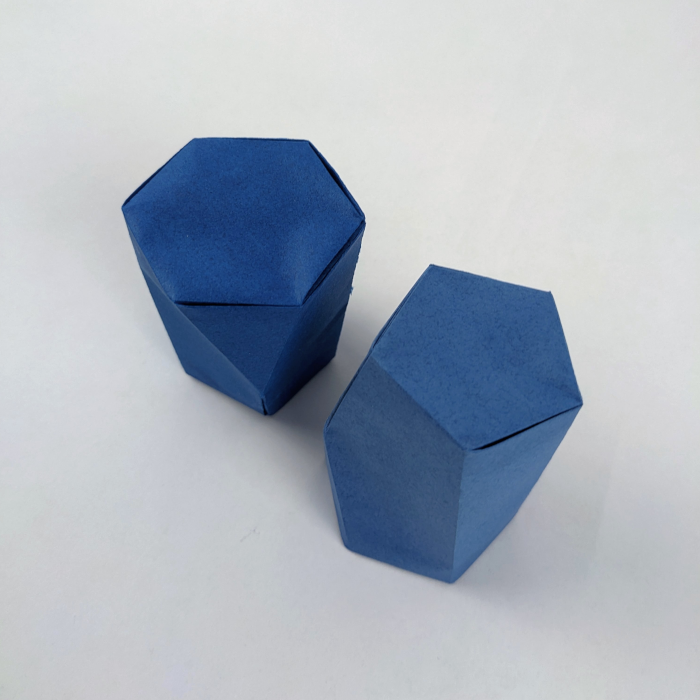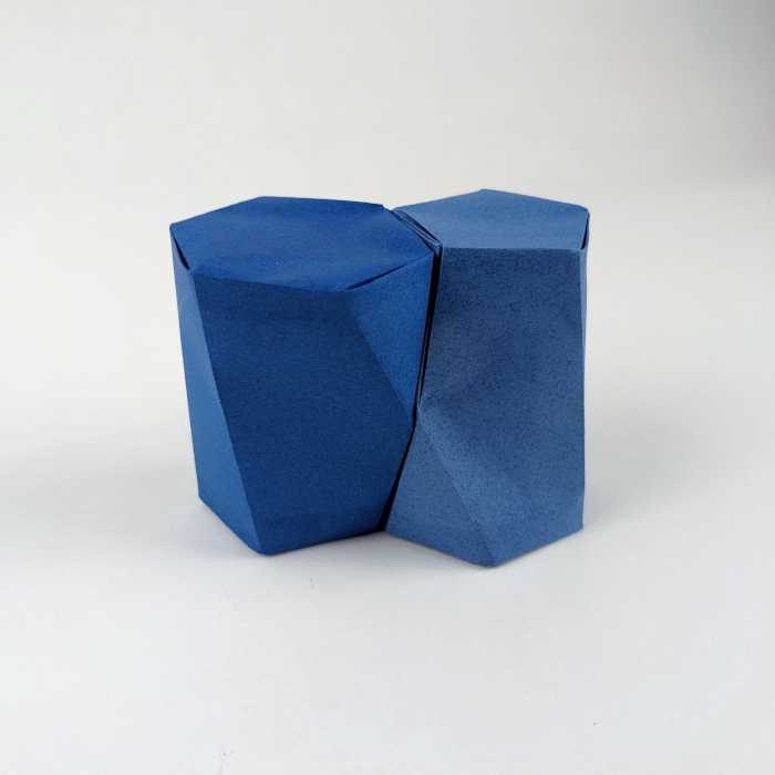La composizione rappresenta una trasposizione in origami della configurazione più comune di due scutoidi identici, ciascuno caratterizzato da una base esagonale e una base pentagonale.